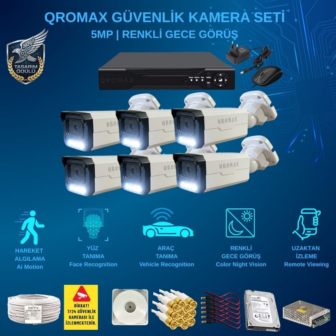 6 Kameralı İnsan Yüz, Araç Tanımalı, Hareket Algılayan, Gece Renkli Gösteren, 5 MP SONY Lensli, 4 Warm LED’li 1080P FULL HD Güvenlik Kamerası Seti